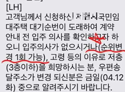 내 순번이 도래하면 LH측에서 전화나 문자로 연락이 옵니다. 다만 위에 알려드린 방법으로 LH측보다 먼저 입주 사실을 알게 된 경우, 먼저 아파트 관리사무실로 연락을 하셔도 괜찮습니다. 관리사무실과 계약일자를 조율하고 진행하게 됩니다. 계약 전 꼭 입주하게 된 아파트를 방문하시고 하자 체크 하셔야합니다.