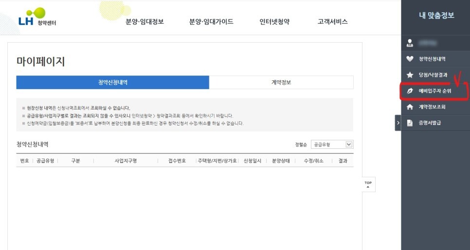 로그인 시 뜨는 화면입니다. 우측 내 맞춤정보 아래세번째에 예비입주자 순위가 있습니다. 이 곳을 클릭하게 되면 예비번호를 받으셨던 분들이 현재 순번을 확인할 수 있습니다.