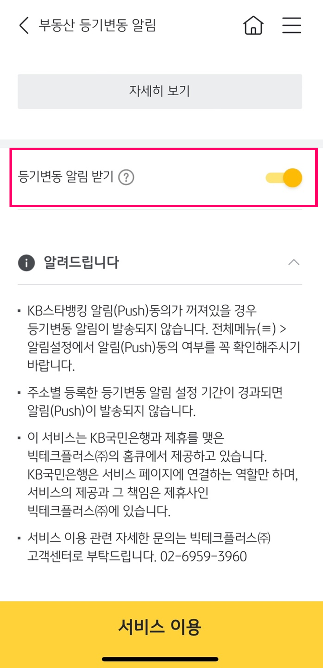 서비스 이용을 클릭한 후, 본격적으로 알림 신청해줍니다.