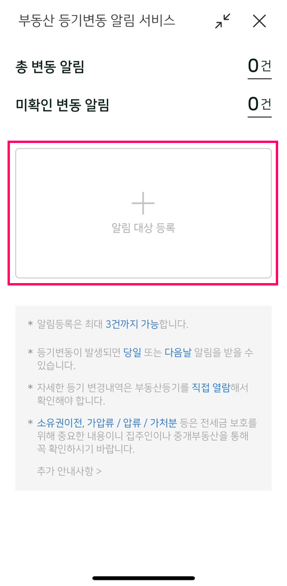 마지막으로 처음 신청화면에서 등기변동 알림받기가 켜져있는지 확인해주시면 됩니다!